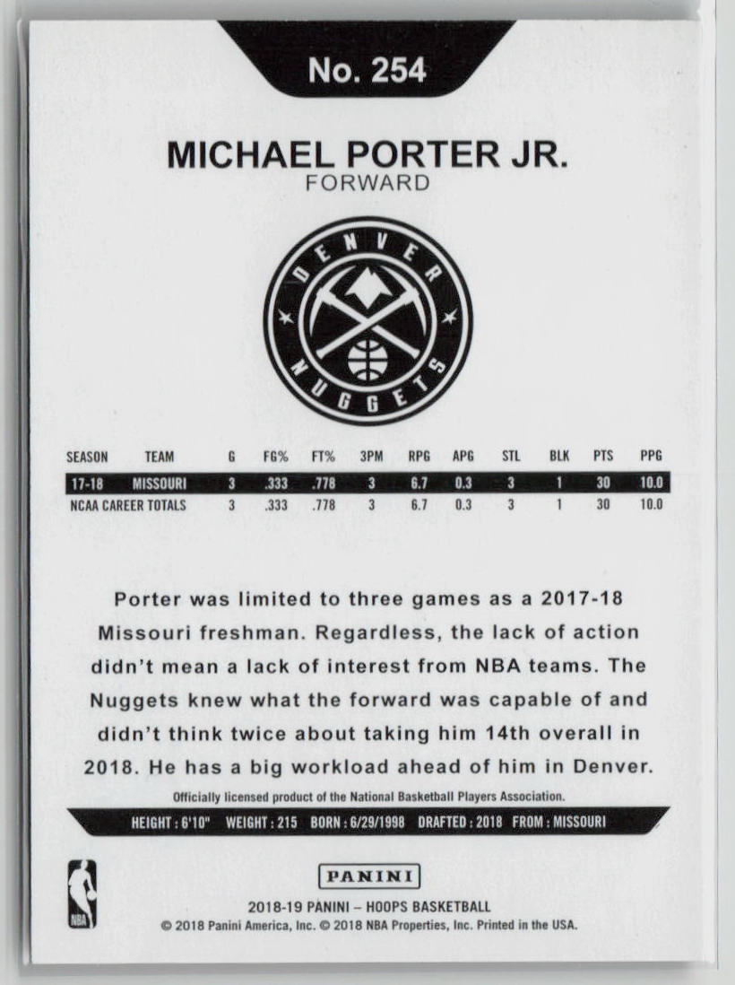 You are purchasing a 2018-19 Panini NBA Hoops Michael Porter Jr. RC 06/25 #254. You will receive the exact item in the photographs. Thank you for looking. Listed With Mascot.
