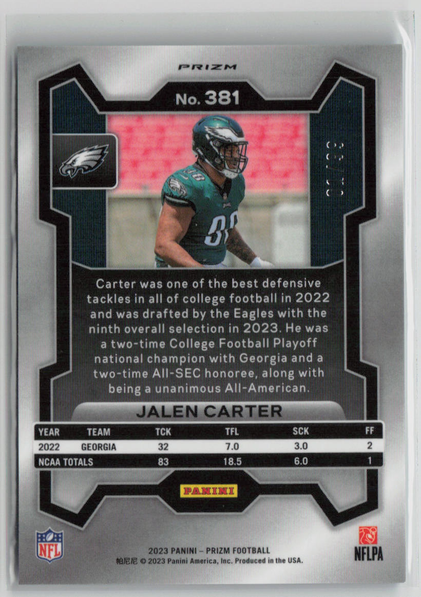 You are purchasing a 2023 Panini Prizm Football Jalen Carter RC Mosaic #381. You will receive the exact item in the photographs. Thank you for looking. Listed With Mascot.