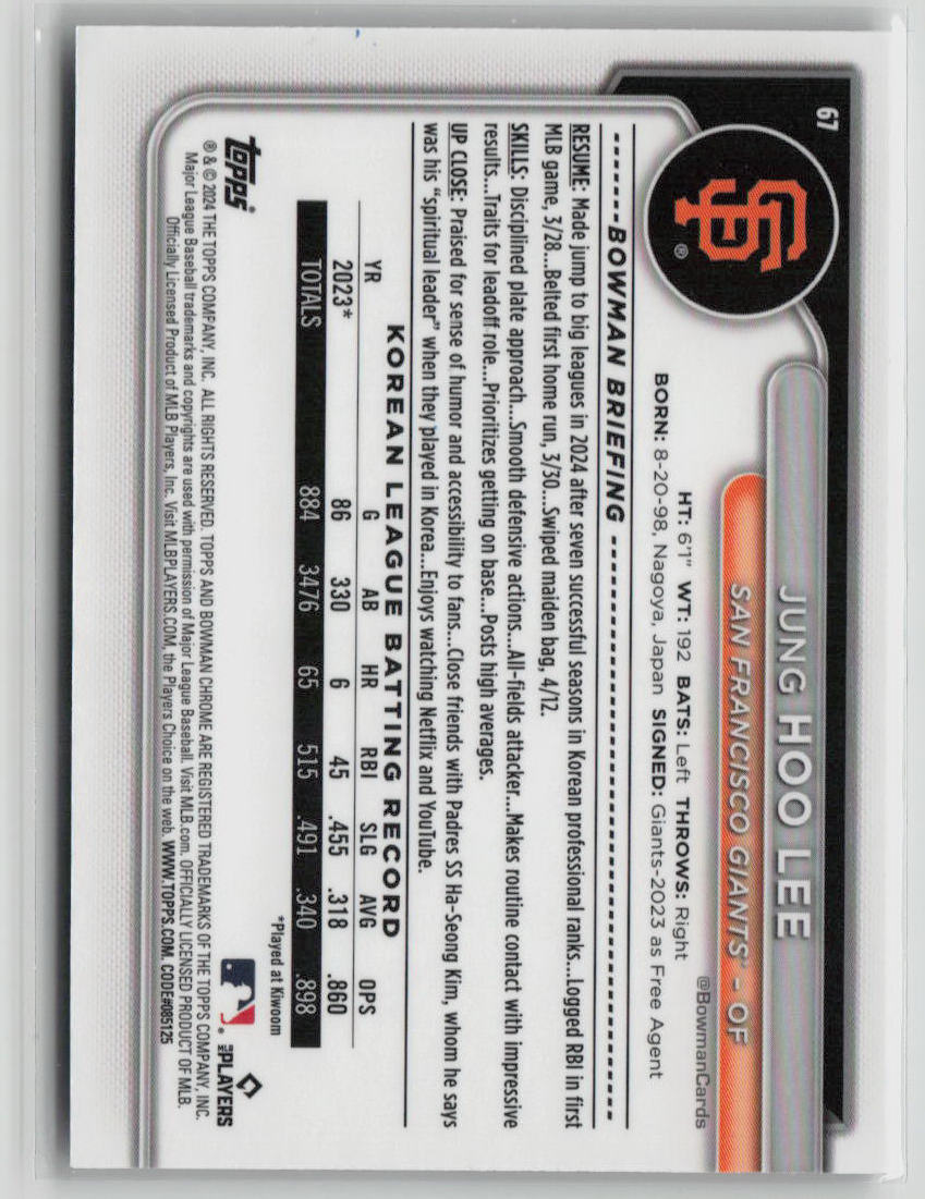 You are purchasing a 2024 Bowman Chrome Jung Hoo Lee 4/12. RC #67. You will receive the exact item in the photographs. Thank you for looking. Listed With Mascot.