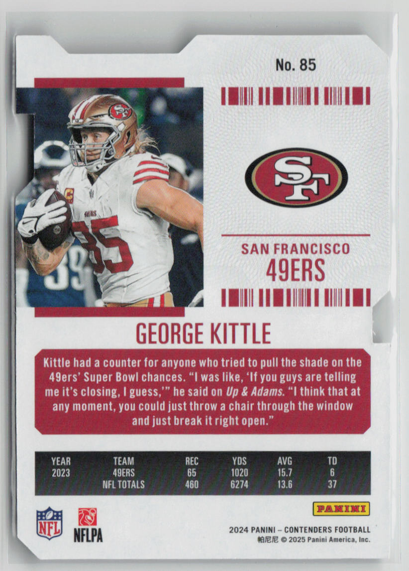 You are purchasing a 2025 Panini Contenders Football George Kittle #85. You will receive the exact item in the photographs. Thank you for looking. Listed With Mascot.