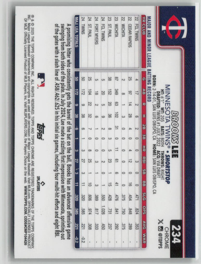 You are purchasing a 2025 Topps Chrome Brooks Lee RC Green #234. You will receive the exact item in the photographs. Thank you for looking. Listed With Mascot.